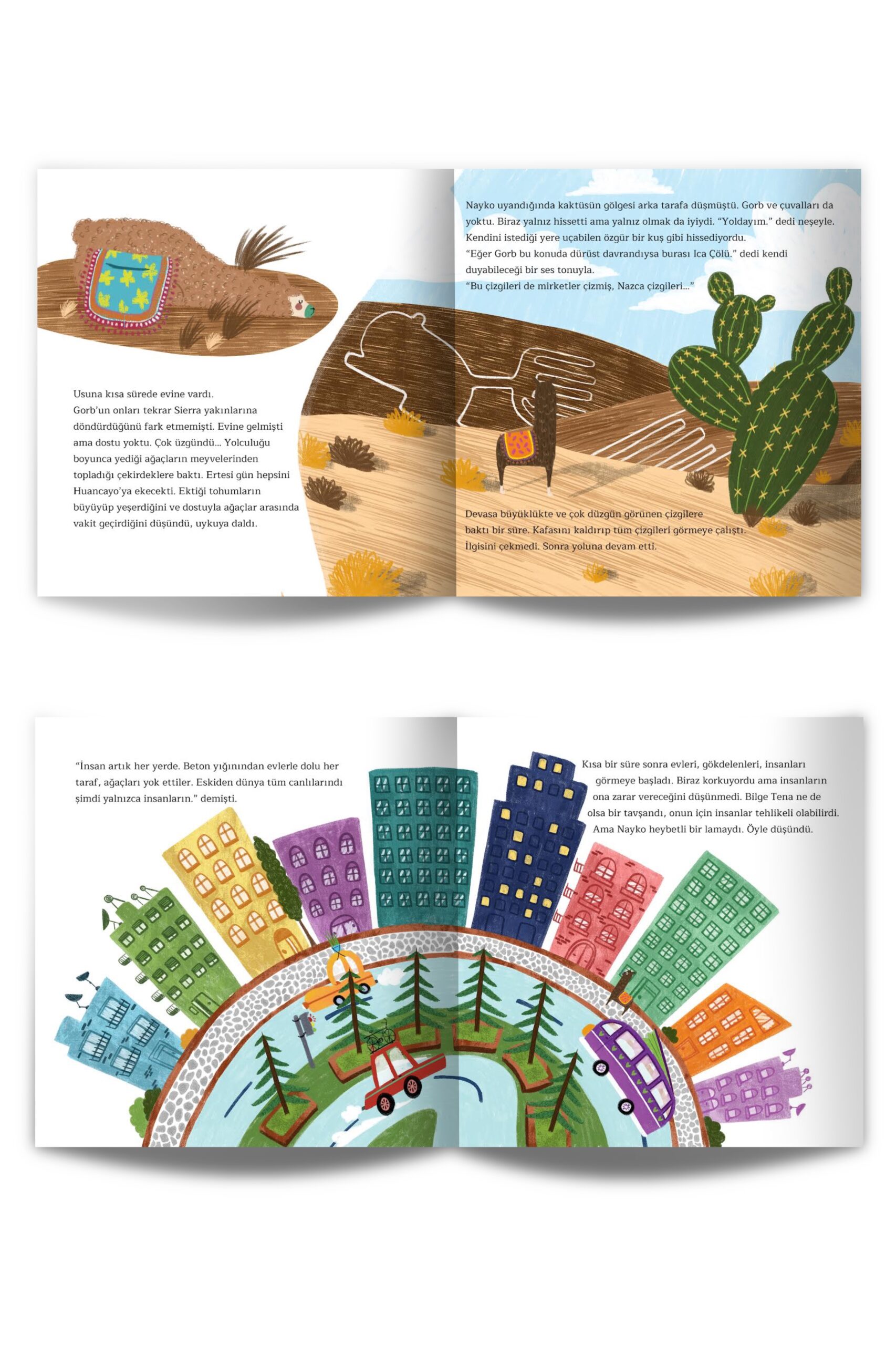 Kısa bir süre sonra evleri, gökdelenleri, insanları görmeye başladı. Biraz korkuyordu ama insanların ona zarar vereceğini düşünmedi. Bilge Tena ne de olsa bir tavşandı, onun için insanlar tehlikeli olabilirdi. Ama Nayko heybetli bir lamaydı. Öyle düşündü.